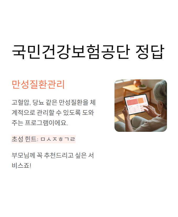 | 국민건강보험공단 | ㅁㅅㅈㅎㄱㄹ | 만성질환관리 | 건강 관리 프로그램 |