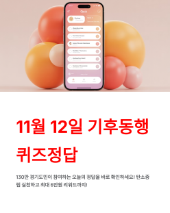 기후동행 퀴즈정답, 11월12일 기후동행, 기후행동 기회소득, 기후동행 오늘의 퀴즈, 경기도 기후동행, 기후동행 앱, 기후 퀴즈 정답, 기회소득 퀴즈, 기후동행 리워드, 탄소중립 퀴즈, 기후행동 앱, 기후동행 참여방법, 11월 퀴즈 정답, 경기도민 혜택, 기후동행 포인트