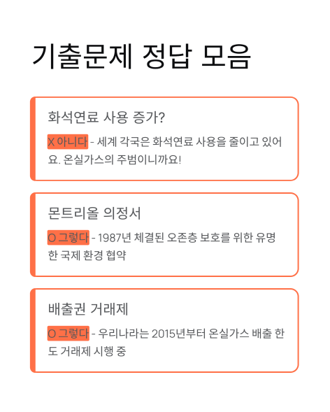 이런 문제들을 보면 패턴이 보이죠? 주로 환경 보호, 기후 변화, 신재생 에너지에 관한 상식 문제들이 출제돼요. 어렵지 않으니까 부담 갖지 마세요!