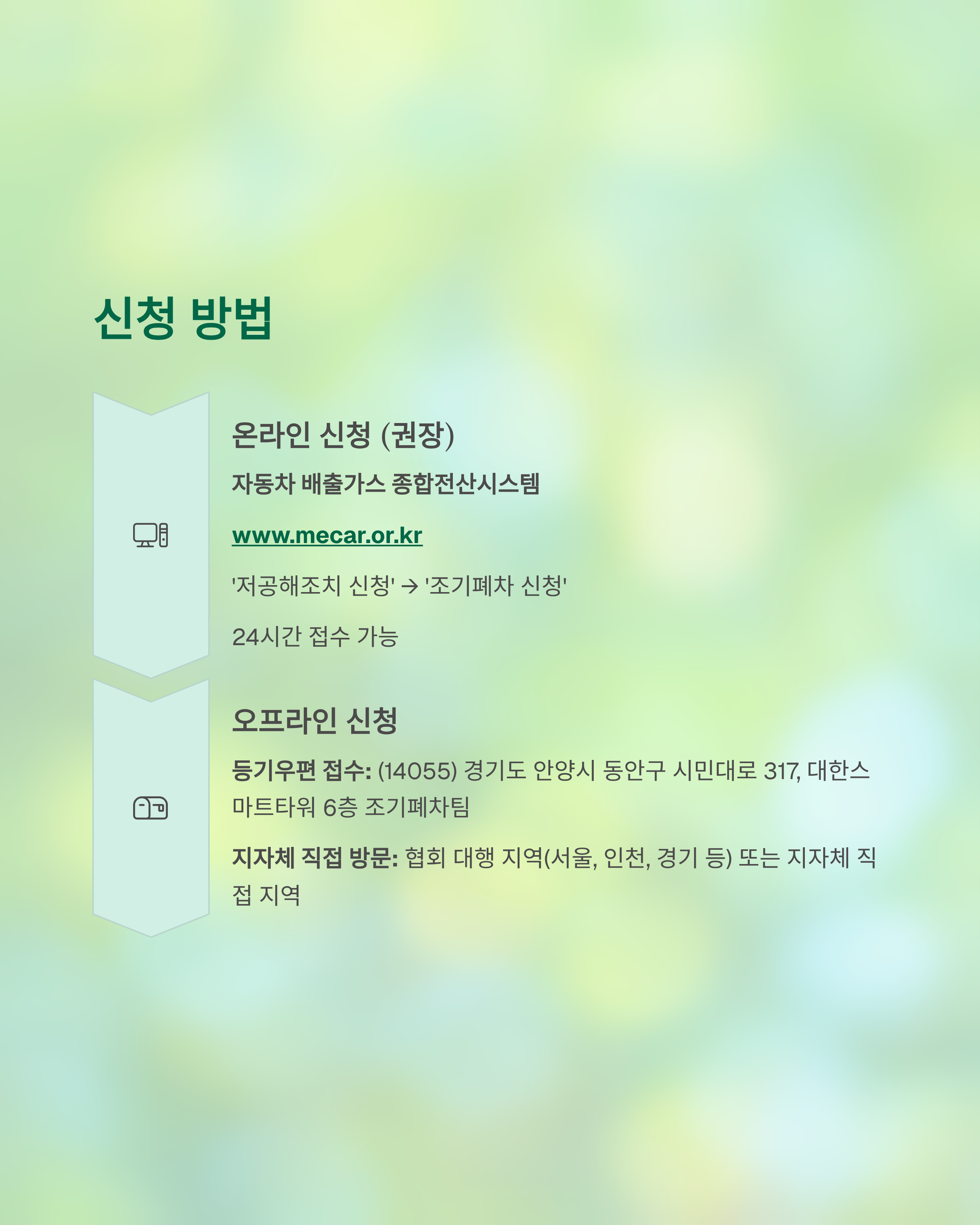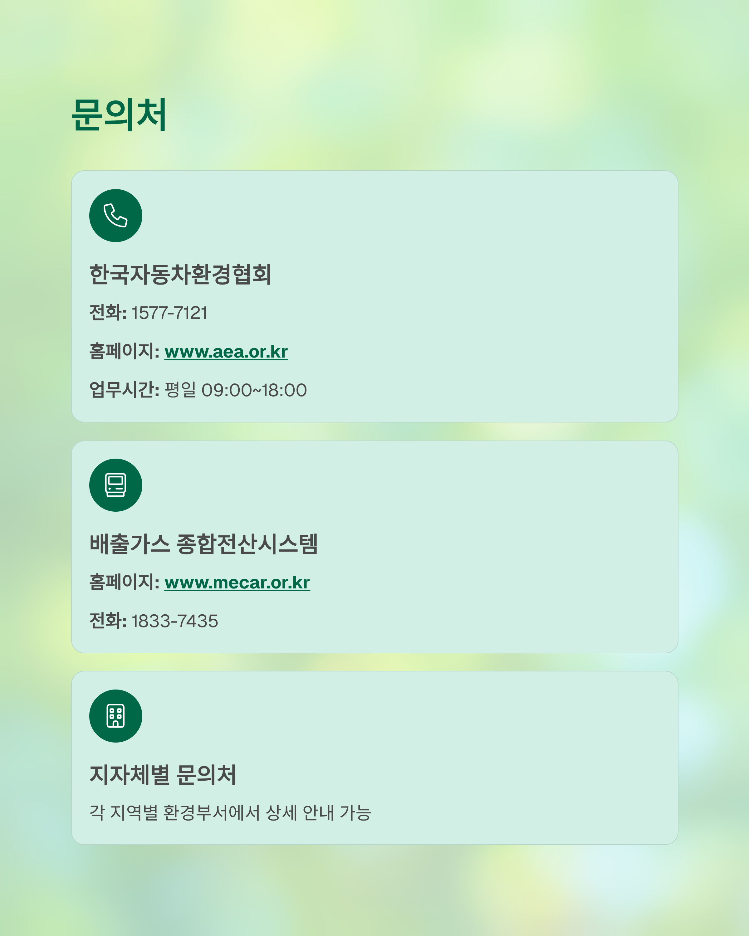 ※ 본 정보는 2025년 1월 환경부 지침을 기준으로 작성되었으며, 지자체별로 세부 사항이 다를 수 있습니다. 정확한 정보는 해당 지자체 또는 한국자동차환경협회에 문의하시기 바랍니다.